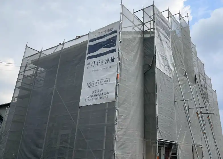 外壁の上辺りや屋根の塗装は高所作業となるため、周りに足場とシートを設置します。